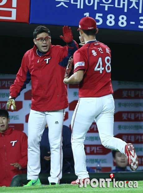 20일 오후 부산 사직야구장에서 열린 ‘2015 타이어뱅크 KBO 리그’ 롯데 자이언츠와 KIA 타이거즈의 경기 4회말에서 KIA 홍건희가 탈삼진 3개로 이닝을 마친 후 서재응의 환영을 받고 있다.