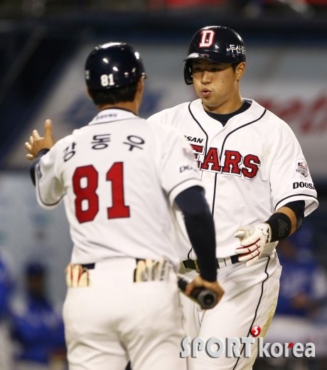 20일 오후 서울 잠실야구장에서 열린 ‘2015 타이어뱅크 KBO 리그’ 두산 베어스 대 삼성 라이온즈 경기 5회말 두산 선두타자 김재환이 솔로홈런을 쳐 홈을 밟은 후 강동우 1루코치의 환영을 받고 있다.
