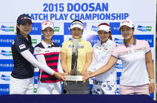 21일 열리는 KLPGA투어 두산 매치플레이 챔피언십을 하루 앞두고 역대 챔피언들이 우승트로피 앞에 모여 선전을 다짐하며 포즈를 취했다. 왼쪽부터 이정민 김자영 윤슬아 양수진 김보경. 사진제공|KLPGA