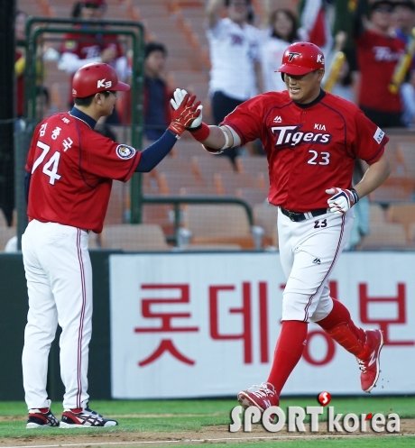 21일 오후 부산 사직야구장에서 열린 ‘2015 타이어뱅크 KBO 리그’ 롯데 자이언츠와 KIA 타이거즈의 경기 4회초 1사에서 KIA 최희섭이 개인통산 100호 홈런을 쏘아올린 후 그라운드를 돌며 3루코치와 하이파이브를 하고 있다.