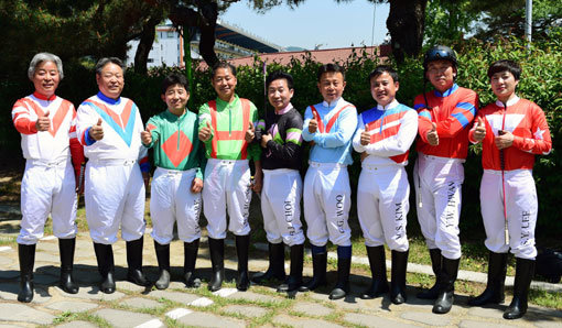 오는 29일 렛츠런서울에서 추억의 이벤트 ‘트레이너스컵’ 경주가 열린다. 이날 경주에는 왕년의 스타 기수 9명이 기수로 활약했던 당시의 기수복을 입고 출전한다. 왼쪽부터 양재철 김점오 박윤규 홍대유 최봉주 우창구 김효섭 황영원 이신영 조교사. 사진제공|한국마사회