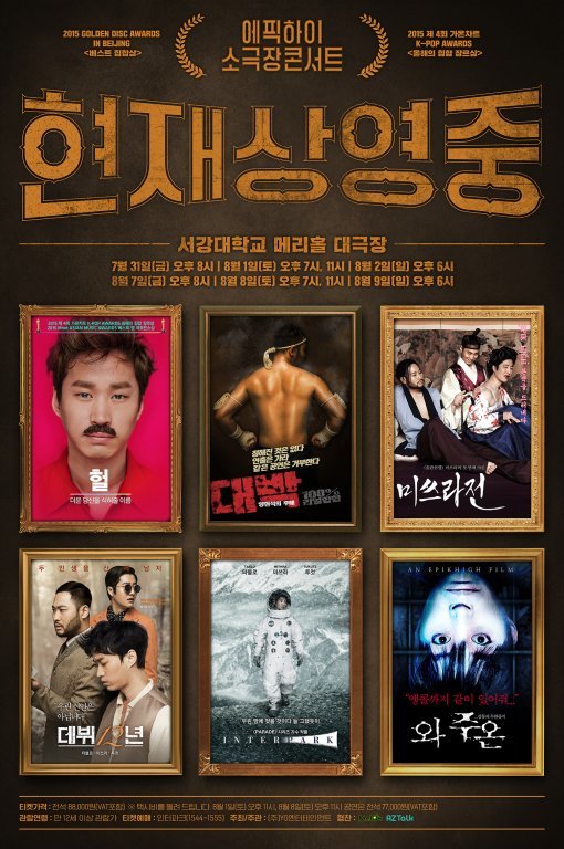 타블로의 아련한 눈빛과 콧수염이 인상적인 ‘헐’과 미쓰라의 뒷모습으로 추정되는 ‘대박’, 능청맞은 에픽하이 멤버들의 표정이 압권이 ‘미쓰라전’과 정반대의 분위기를 자아내는 ‘데뷔 12년’, 우주복을 입고 있는 DJ투컷이 돋보이는 ‘INTERPARK’와 타블로의 표정이 인상적인 ‘와 주온’ 등 이번 콘서트 내용의 힌트가 담긴 포스터들은 에픽하이가 제시하는 6가지 공연테마와 어우러져 웃음을 자아내고 있다.