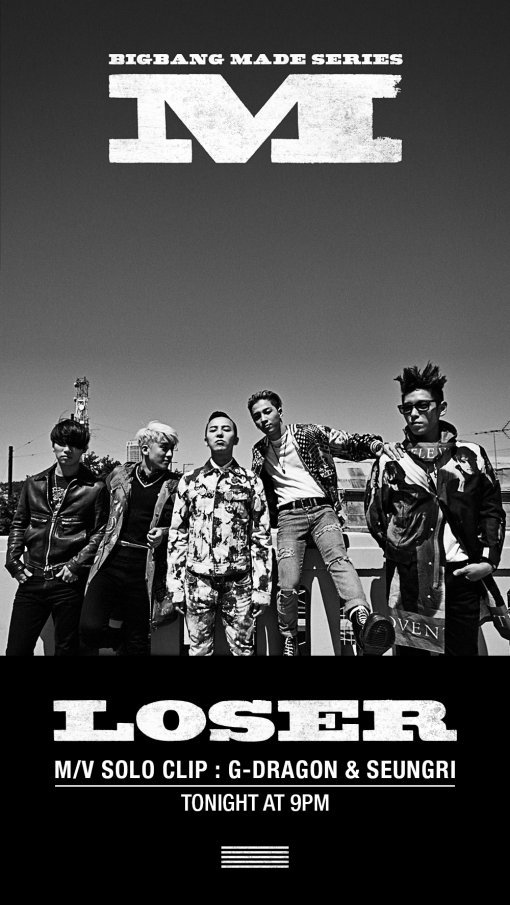 YG엔터테인먼트는 22일 오후 3시 공식블로그(www.yg-life.com)를 통해 빅뱅 ‘LOSER’ 뮤직비디오 중 지드래곤과 승리의 솔로클립 영상 공개를 알리는 티저 이미지를 선보였다. 빅뱅 멤버들의 모습이 흑백 사진으로 담겨있는 이번 티저 이미지에는 ‘BIGBANG MADE SERIES ‘M’ / LOSER M/V SOLO CLIP : G-DRAGON & SEUNGRI’라는 문구와 함께 오늘 저녁 9시 지드래곤과 승리의 솔로클립 영상이 공개될 것임을 예고했다.