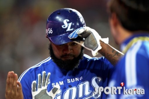 22일 오후 광주-기아 챔피언스필드에서 열린 ‘2015 타이어뱅크 KBO 리그’ KIA 타이거즈와 삼성 라이온즈의 경기 삼성 7회초 1사 2루에서 박한이의 적시타 때 2타점 2루타를 치고 진루했던 2루주자 나바로가 득점을 올리고 덕아웃에서 동료선수들과 하이파이브를 나누고 있다.