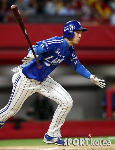 22일 오후 광주-기아 챔피언스필드에서 열린 ‘2015 타이어뱅크 KBO 리그’ KIA 타이거즈와 삼성 라이온즈의 경기에서 삼성 7번타자 구자욱이 7회초 선두타자로 나와 1루수 옆을 뚫는 2루타를 날리고 있다.