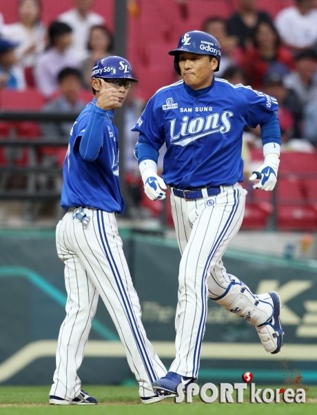 22일 오후 광주-기아 챔피언스필드에서 열린 ‘2015 타이어뱅크 KBO 리그’ KIA 타이거즈와 삼성 라이온즈의 경기에서 삼성 6번 이승엽이 2회초 1사 후 중월 솔로홈런을 치고 3루 김재걸코치의 격려를 받으며 홈으로 향하고 있다.