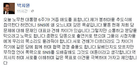 한편 박지원 새정치민주연합 의원은 23일 노무현 대통령 서거 6주기를 맞아 추도식 참석차 봉하마을로 향하는 길에 SNS에 이에 관한 글을 올렸다. 박지원 의원은 “제가 봉하마을 추도식에 참석한다 하였더니 SNS에 왜 오느냐며 갖은 욕설”이라고 털어놨다.