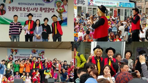 태진아와 강남은 23일 제주 중문향토오일시장을 방문해 상인들을 격려하고 관광객, 시민들과 뜻 깊은 만남의 시간을 가졌다. 중문향토오일시장은 제주 오일장 중 규모 면에서 작으나 예전 모습을 그대로 간직한 전통시장으로 서민경제 활성화를 촉구하는데 최적지로 손꼽히는 곳이다.
