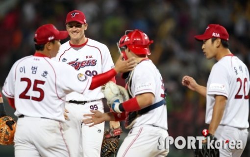9회에 등판 세이브를 올린 윤석민과 결승타를 친 필 등 KIA선수들이 승리의 기쁨을 나누고 있다.