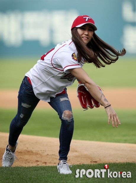 23일 오후 광주-기아 챔피언스필드에서 열린 ‘2015 타이어뱅크 KBO 리그’ KIA 타이거즈와 삼성 라이온즈의 경기에서 스포츠클라이밍 국가대표 사솔이 시구하고 있다.