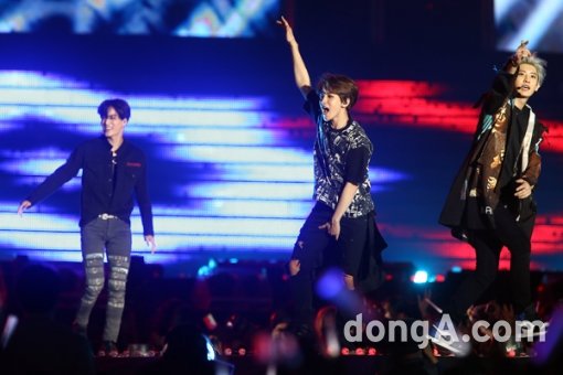 엑소가 23일 오후 서울시 마포구 상암월드컵경기장에서 열린 '사랑한다 대한민국 2015 드림콘서트'에서 멋진 공연을 하고 있다.