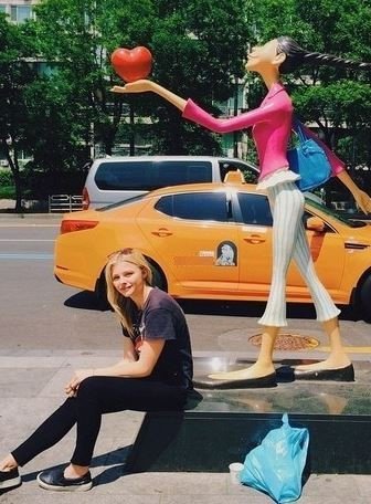 공개된 사진 속 클로이 모레츠는 서울의 모처에서 여성 조각상 앞에서 카메라를 보고 포즈를 취하고 있다.