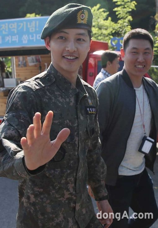 배우 송중기가 26일 오전 강원도 고성 제22사단 수색대대에서 전역신고를 마친 뒤 인사를 하고 있다.