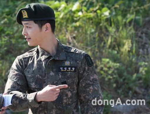 배우 송중기가 26일 오전 강원도 고성 제22사단 수색대대에서 전역신고를 마친 뒤 인사를 하고 있다.