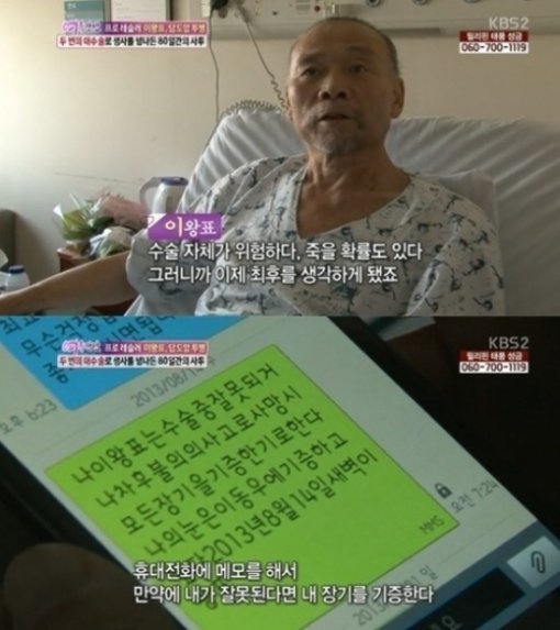 이날 이왕표는 담도암 수술에 대해 “위험한 수술이고, 죽을 확률도 있다고 하니 최후를 생각하게 됐다”고 입을 열었다.