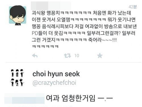 25일 한 누리꾼은 트위터에 맹기용 셰프에 대해 “괴식왕 맹꽁치, 처음엔 화가 났는데 이젠 웃겨서 오열한다. 뭐가 웃기냐면 맹꽁 음식 레시피보다 저걸 여과 없이 방송으로 내보낸 PD들이 더 웃긴다”란 글을 올렸다.