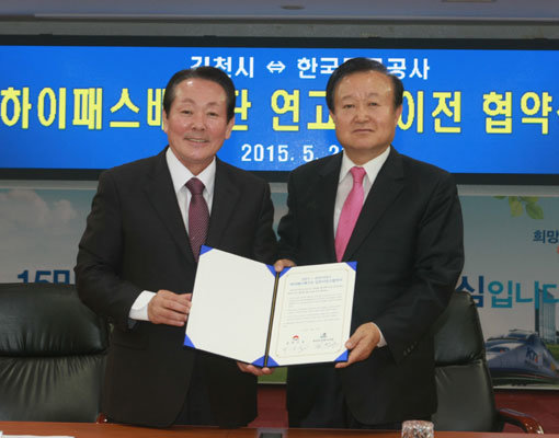 도로공사가 경북 김천시에 새롭게 둥지를 마련했다. 김학송 도로공사 사장(왼쪽)과 박보생 김천시장이 21일 열린 연고 이전 협약식에서 기념촬영을 하고 있다. 사진제공|도로공사 배구단