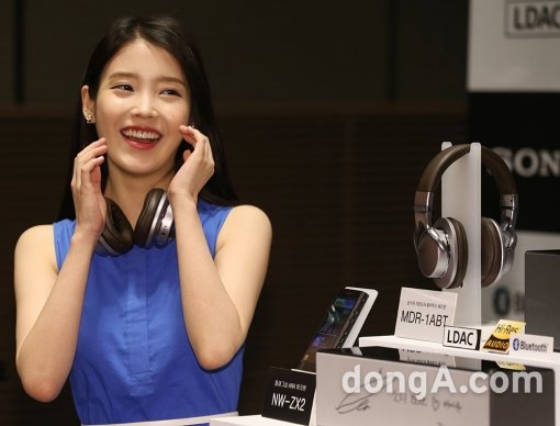 가수 아이유가 27일 오전 서울 동대문구 JW메리어트 동대문 스퀘어에서 열린 소니코리아 프리미엄 블루투스 오디오 라인업 신제품 출시행사에 참석해 포토타임을 하고 있다.