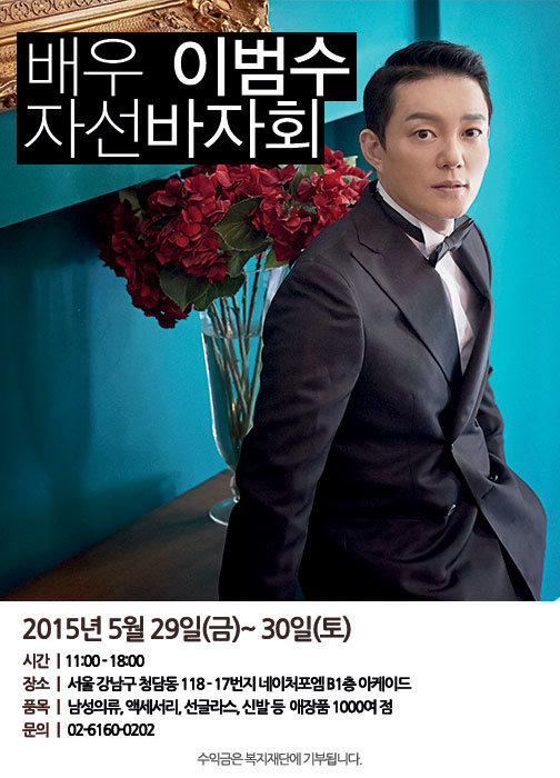 이범수는 29일, 30일 양일간 서울 청담동 네이처포엠 지하 1층 아케이드에서 자선 바자회를 연다. 바자회를 통해 얻어진 수익금은 복지재단에 기부할 예정이다.