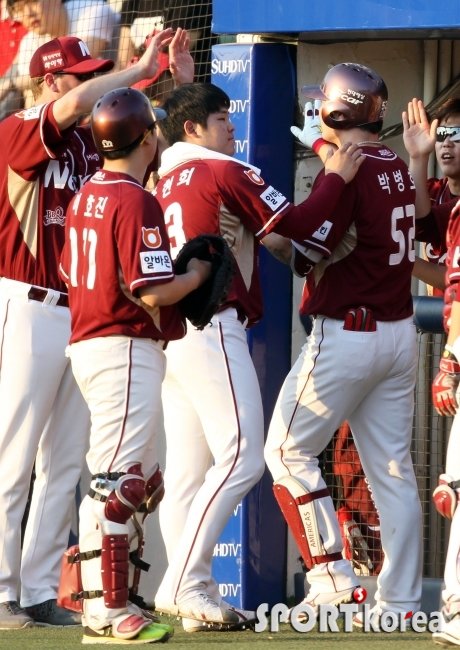 27일 오후 대구 시민구장에서 열린 ‘2015 타이어뱅크 KBO 리그 프로야구’ 삼성 라이온즈와 넥센 히어로즈의 경기에서 넥센 4번타자 박병호가 1회초 무사 2,2루에서 비거리 135미터의 장외 중월 스리런홈런을 날리고 홈인한 뒤 선발 한현희 등 동료선수들의 환영을 받고 있다.