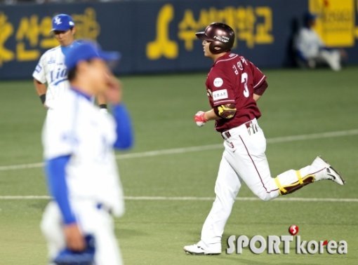 27일 오후 대구 시민구장에서 열린 ‘2015 타이어뱅크 KBO 리그’ 삼성 라이온즈와 넥센 히어로즈의 경기에서 넥센 6번타자 김민성이 5회초 무사에서 유한중에 이어 백투백으로 비거리 120미터 좌월 솔로홈런을 치고 베이스를 돌고 있다.