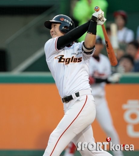 28일 오후 대전 한화생명 이글스 파크에서 열린 ‘2015 타이어뱅크 KBO 리그 프로야구’ 한화 이글스 대 KIA 타이거즈 경기 2회말 무사 1,3루에서 한화 주현상이 1타점 희생플라이를 치고 있다.