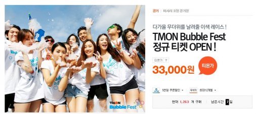 티켓몬스터는 바모스커뮤니케이션과 공동 주최하는 체험형 문화 콘텐츠 티몬 어드벤처의 이색 마라톤 ‘티몬 버블페스트 5K’ 정규티켓을 6월 5일까지 판매한다고 밝혔다. 티몬 버블페스트 5K는 국내 최초로 ‘거품’을 테마로 한 이색 마라톤으로 참가자들은 비누거품을 맞으며 5Km 구간을 달리게 된다. 연인과 참가해 추억을 만들 수 있는 ‘버블 쇼’와 네 가지 색깔의 거품으로 옷을 흠뻑 적시는 ‘버블 존’ 등 다양한 재미를 제공한다. 모든 참가자에게는 티셔츠와 선글라스, 수건이 기념품으로 지급되고 달리기 중에도 사진을 찍을 수 있는 방수팩까지 무료로 받을 수 있다.