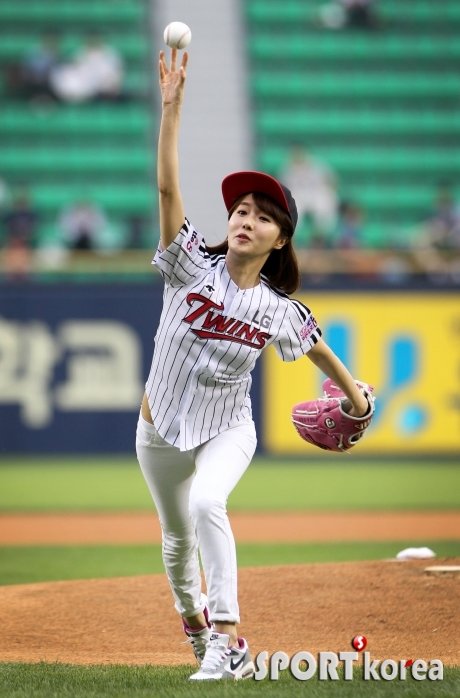29일 오후 서울 잠실야구장에서 열린 ‘2015 타이어뱅크 KBO 리그’ LG 트윈스와 삼성 라이온즈의 경기에서 가수 이정현이 시구하고 있다.