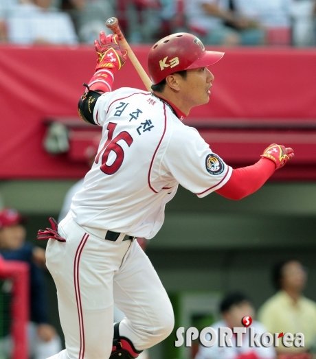29일 오후 광주-기아 챔피언스필드에서 열린 ‘2015 타이어뱅크 KBO 리그’ KIA 타이거즈 대 NC 다이노스 경기 1회말 1사 2루에서 KIA 김주찬이 1타점 2루타를 치고 있다.