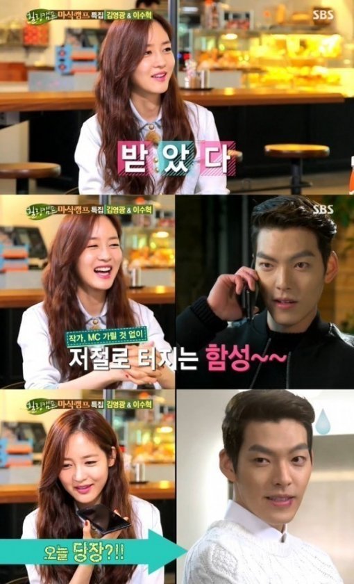 이어 김우빈이 전화를 받자 김영광은 성유리에게 핸드폰을 넘겼다. 그러자 성유리는 “형들 자랑 좀 해 달라”라며 MC로 진행하기 시작했다. 이에 김우빈은 “좋은 친구 같은 느낌이다. 평소에 의지를 많이 하고 좋아하는 형들이다”라며 “너무 교과서 같은 대답이었죠?”라고 말했다,