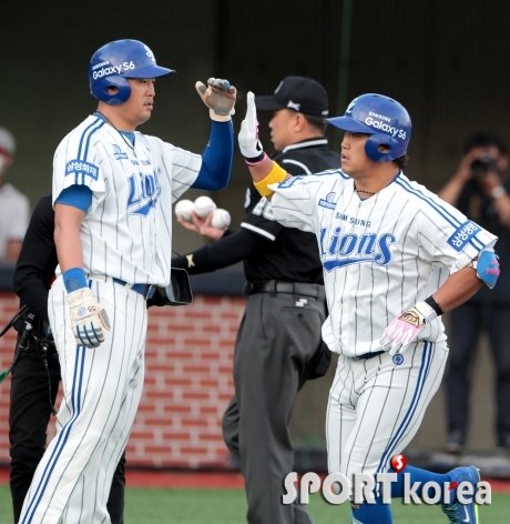 3일 오후 포항야구장에서 열린 ‘2015 타이어뱅크 KBO 리그’ 삼성 라이온즈 대 롯데 자이언츠 경기 1회말 1사 1,2루에서 삼성 박석민이 스리런 홈런을 쳐 홈을 밟은 후 선행주자 박한이의 환영을 받고 있다.