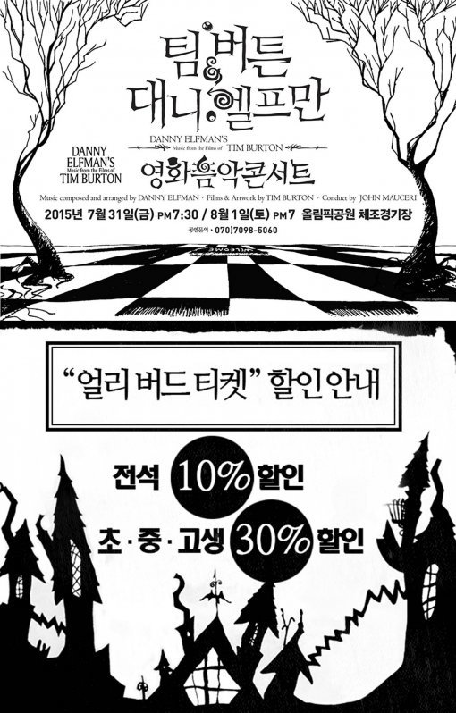영화음악가 '대니 엘프만(DANNY ELFMAN)'과 '팀 버튼(TIM BURTON)'이 공동작업을 통해, 2013년 런던 로얄 알버트홀 (ROYAL ALBERT HALL)에서의 성공적인 초연을 거쳐, 월드 투어 중인 '팀 버튼& 대니 엘프만 영화음악콘서트(DANNY ELFMAN’S Music From the Film of TIM BURTON)'의 서울 공연이 오는 7월 31일과 8월 1일 이틀간 열릴 예정이다.