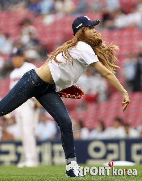 4일 오후 서울 잠실야구장에서 열린 ‘2015 타이어뱅크 KBO 리그’ 두산 베어스와 KIA 타이거즈의 경기에서 EXID 하니가 시구를 하고 있다.
