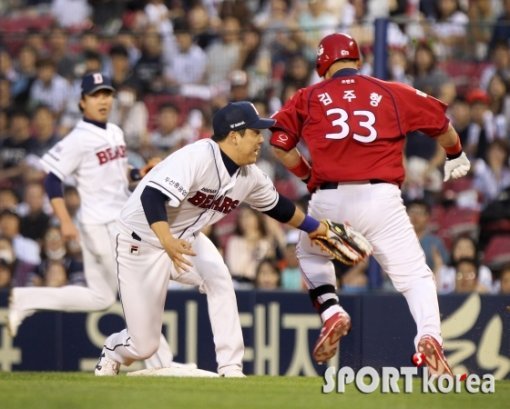 4일 오후 서울 잠실야구장에서 열린 ‘2015 타이어뱅크 KBO 리그’ 두산 베어스와 KIA 타이거즈의 경기 KIA 7번타자 김주형이 4회초 2사 후 유격수 깊숙한 타구로 1루에서 두산 김현수의 태그를 피하며 세이프 되고 있다.
