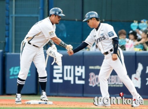 7일 오후 창원 마산야구장에서 열린 ‘2015 타이어뱅크 KBO 리그 프로야구’ NC 다이노스 대 삼성 라이온즈 경기 4회말 무사 1,2루에서 NC 이호준이 1타점 적시타를 친 후 전준호 1루코치의 환영을 받고 있다.