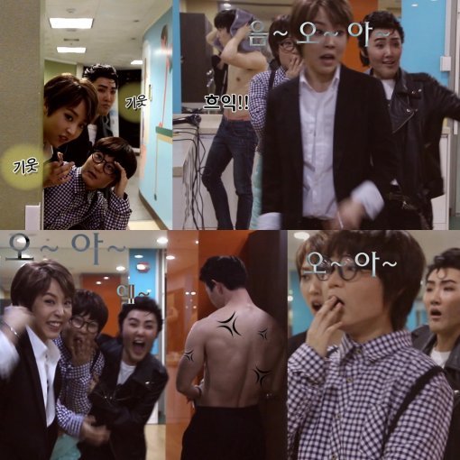 남자 탈의실에 들어간 세 사람은 들어서자마자 탈의를 하고 있는 남자들을 발견하고 "음~"하며 훔쳐보다가 탄탄한 근육질 몸매의 남자들이 등장하자 "오~", "아~", "예~"를 연거푸 외치는 동시에 주먹을 불끈 쥐고 환호성을 질러 웃음을 유발한다.