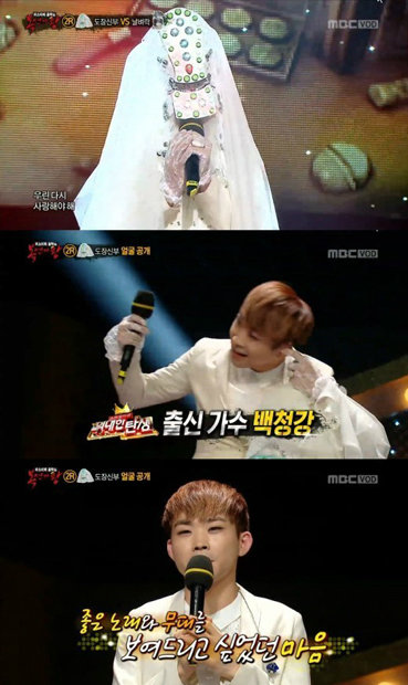 이날 방송에서 미스터리 도장신부는 가수 왁스의 ‘화장을 고치고’를 열창했으나 패해 복면을 벗었다. ‘복면가왕’ 판정단들은 미스터리 도장신부를 여자로 예상했으나 그의 정체는 가수 백청강이었다.
