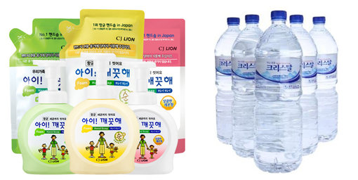 ‘아이깨끗해’ 손세정제-‘크리스탈’ 생수(오른쪽)
