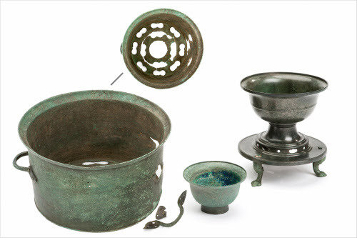 출토된 유물은 거꾸로 엎은 청동시루 아래에서 향로가 넘어져 반쯤 걸쳐진 상태로 발견됐다. 시루 안에 꽉 차있던 흙 내부에서 청동완과 시루의 나머지 손잡이 한쪽 역시 확인됐다. 출토 상태로 보면 지름 50cm의 구덩이를 파서 청동향로를 놓고 그 위에 뚜껑 용도로 청동완을 덮은 후 그 위에 다시 청동시루를 덮어서 묻어놓은 것으로 보인다.
