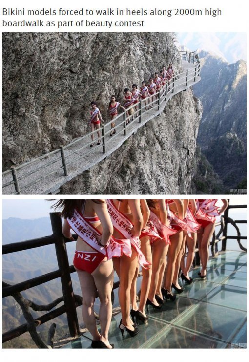 공개된 사진을 보면 비키니 차림에 하이힐을 신은 여성 참가자들이 중국 윈난성 라오쥔산의 해발 2000m 높이의 산책로를 따라 걸으며 포즈를 취하고 있다.