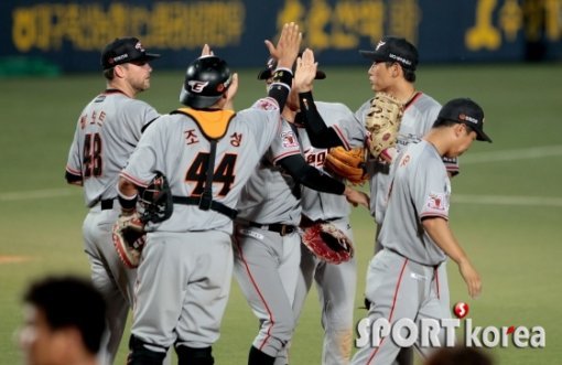 경기종료 후 한화 선수들이 마운드 위에서 승리의 기쁨을 나누고 있다.