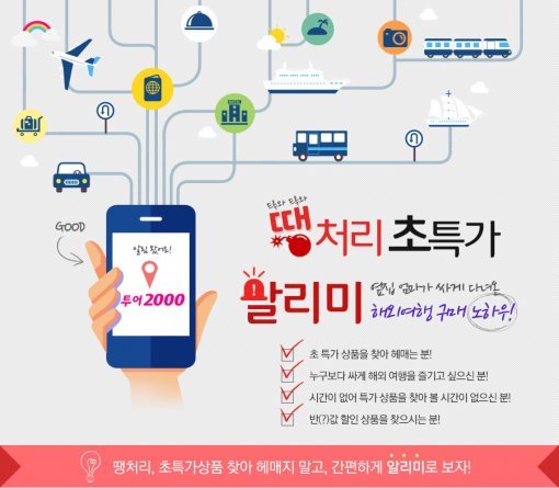 패키지여행 전문 여행사 투어2000은 최근 땡처리 초특가 알리미를 출시했다. 인터텟 홈페이지에서 이메일 주소 또는 휴대폰 번호를 선택해서 땡처리 초특가 알리미를 신청하면 시장대비 땡처리 초특가상품 가격으로 진행될 경우 이메일이나 문자로 정보를 제공한다.