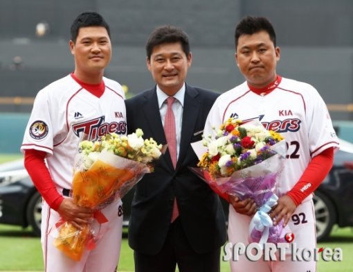 3일 오후 광주-기아 챔피언스필드에서 열린 ‘2015 타이어뱅크 KBO 리그’ KIA 타이거즈와 삼성 라이온즈의 경기에 앞서 KIA 김상훈과 유동훈이 은퇴식을 가졌다.