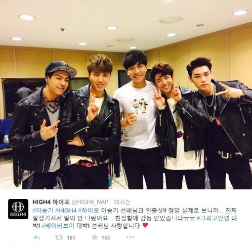 하이포는 14일 밤 자신들의 SNS를 통해 "#이승기 #HIGH4 #하이포 이승기 선배님과 인증샷!! 정말 실제로 보니까 진짜 잘생기셔서 말이 안 나왔어요. 친절함에 감동 받았습니다 #그리고안녕 대박! #베이비보이 대박! 선배님 사랑합니다"라는 게시물을 올렸다.