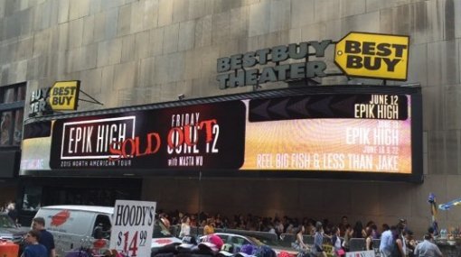 12일과 13일(미국 현지시간) 미국 뉴욕 타임스퀘어에 위치한 베스트바이시어터(BEST BUY THEATER)에서 개최된 에픽하이의 콘서트는 공연 시작 전부터 긴 줄을 선 관객들로 성황을 이뤘다.