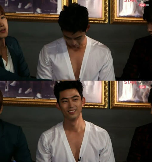 이날 옥택연은 가슴 깊이 파진 V넥 티셔츠를 입어 눈길을 끌었다. 이에 2PM은 “팬들이 옥택연 가슴골 밖에 안보인다고 한다”라고 눙쳤다.