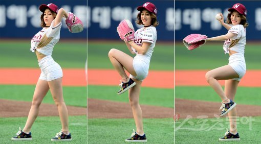 걸그룹 ‘트렌디’의 루루가 시구를 던지고 있다.