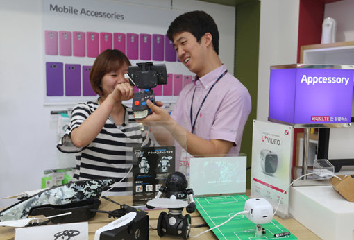 소비자들이 LG유플러스 플래그십 매장에서 스마트폰과 연동해 이용할 수 있는 앱세서리를 체험하고 있다. 사진제공|LG유플러스