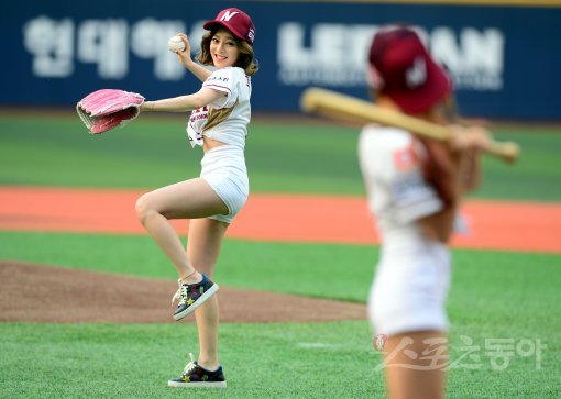 걸그룹 ‘트렌디’의 보나가 시타를 루루가 시구를 던지고 있다.