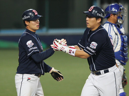 두산 김현수(오른쪽)가 16일 대구 삼성전에서 0-1로 뒤진 4회초 윤성환을 상대로 역전 2점홈런을 날리고 홈으로 들어와 민병헌의 환영을 받고 있다. 사진제공|스포츠코리아